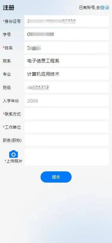 1999级以后校友,基本信息会自动填写,提交之后不需要管理人员审核,提交完成之后,可直接登录系统,查看校友卡。