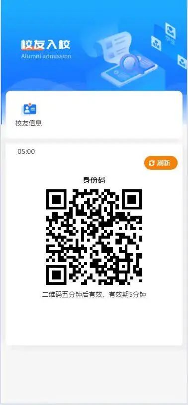 点击校友信息,可查看电子校友卡。可刷身份码进入校园。(身份码需等待5分钟后生效,有效期5分钟,过期后可点击刷新,重新生成二维码)